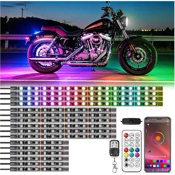 NEW DESIGNED DREAM COLOR CHASING FEATURES:The new features of motorcycle LED underglow kit designed with an independent control IC, supporting multiple RGB static colors, and 256 dream chasing mode, such as chasing, running, flowing, jumping, and more, creating an enchanting spectacle as if the lights are chasing each other, setting a romantic and magical atmosphere.
