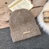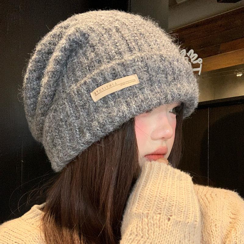 Gray knitted wool hat women's winter versatile warm pile hat showing face small cold hat ear protector bag head hat