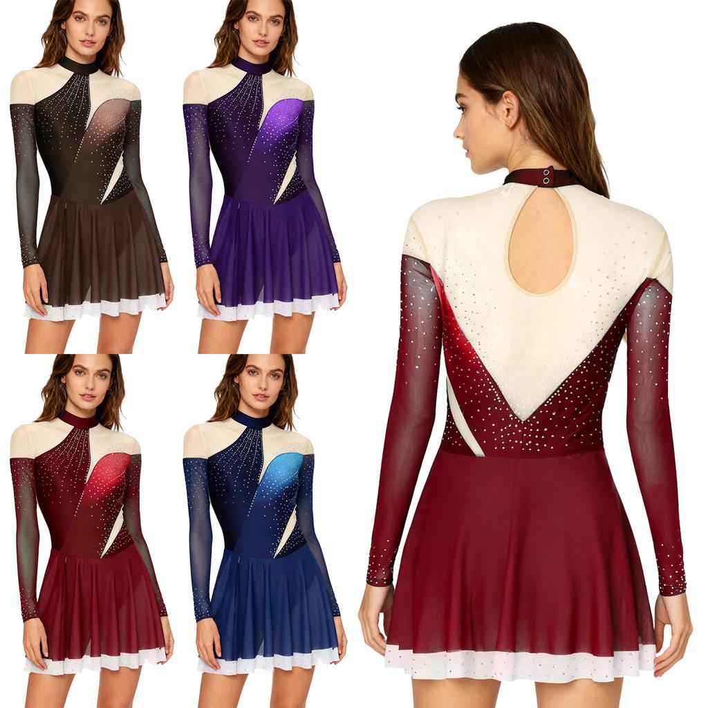 Damen Eiskunstlaufkleid Glänzende Strasssteine Farbverlauf Stehkragen Mesh Lange Ärmel Tanzbekleidung