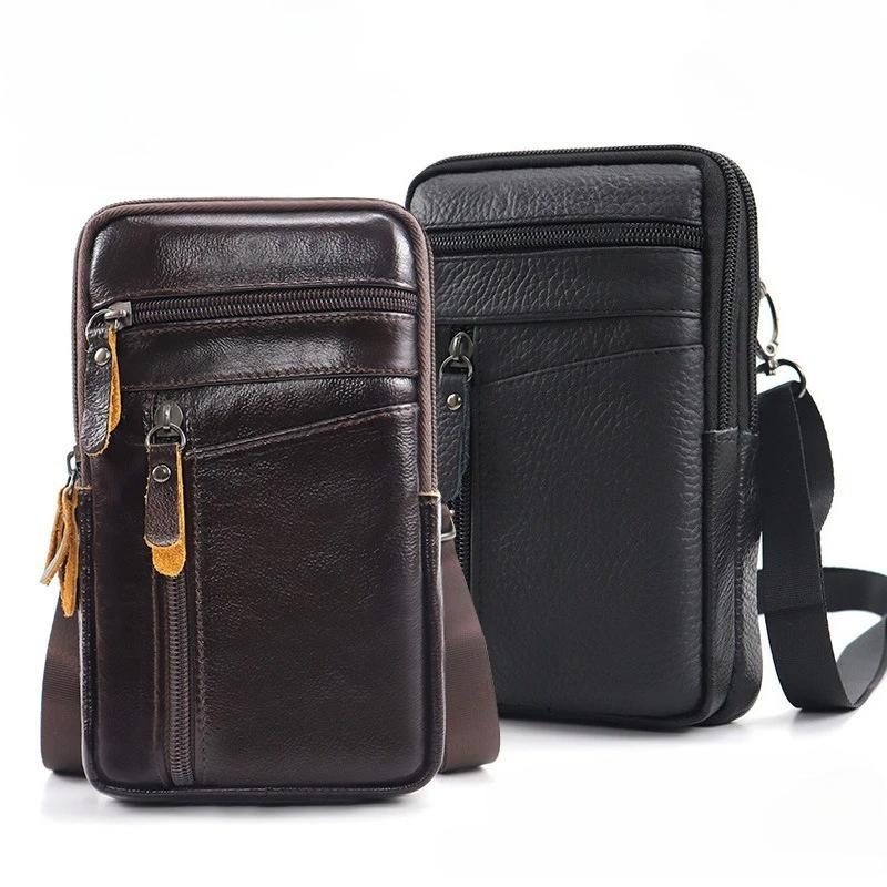 Herren Echte Leder Handy Tasche Crossbody, Vintage Kleine Umhängetasche, Kompakte Hüfttasche mit Reißverschlussfächern, Outdoor Reise Tasche