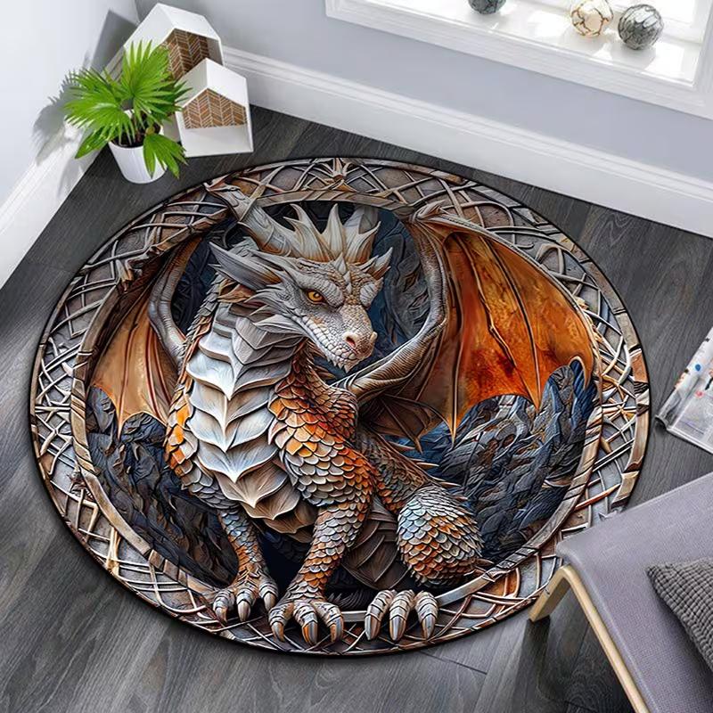 3D Drachenteppich Silbergrau Fantasiewesen Runder Teppich mit Orange Schwarzen Details Lebendige Schuppe Flügel Heimdeko Fußmatte