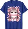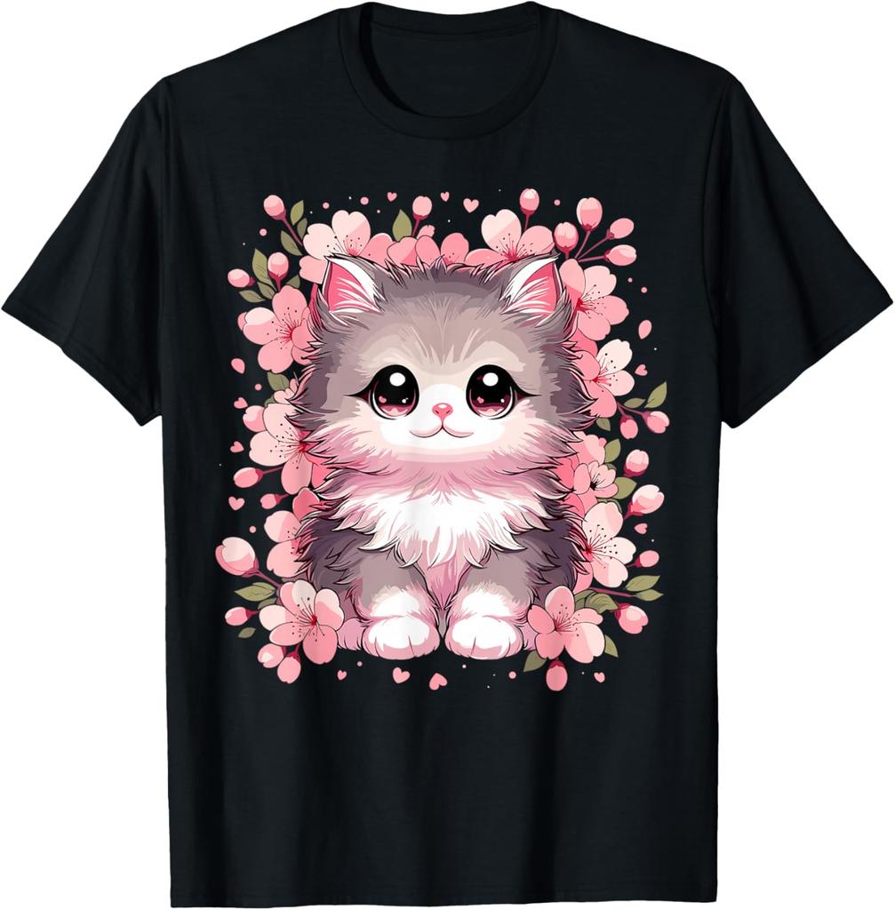 Cute Kawaii Kitten Cherry Blossoms Graphic T-Shirt Soft Cotton Casual Round Neck Tee