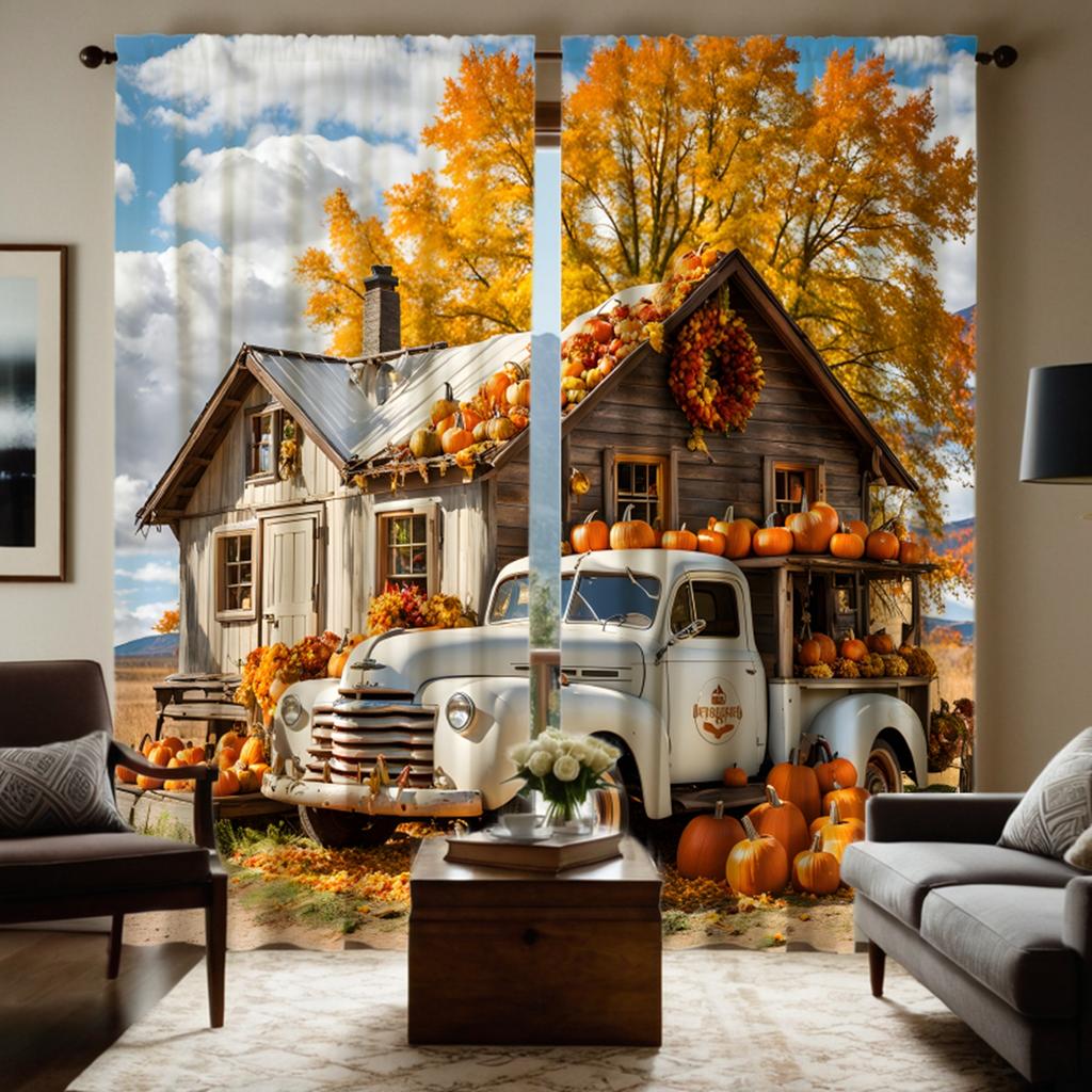 2 Stück HD Vintage Herbsternte Hintergrund Kürbis Bus Landhaus dekorativer Vorhang Gelber Bindeband digital bedruckter Vorhang Heimde