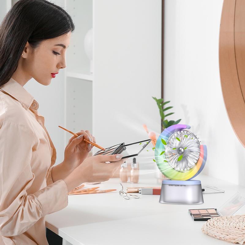 Rechargeable Desk Fan Colorful Quiet Cooling Fan USB Rechargeable Camping Fan With Flashing Light 3 Speeds Adjustable Portable