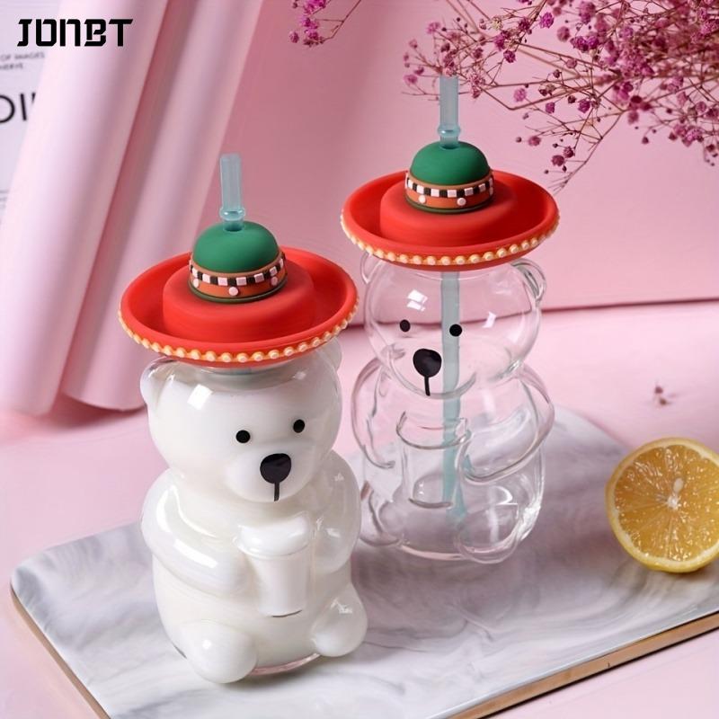 Niedlicher Bär Glasbecher für Kinder Hochtemperaturbeständige Transparente Gläser mit Strohhalmdeckeln Kaffeetassen Getränke Trinkgeschirr Geschenk