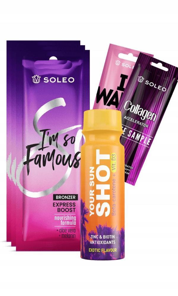 Soleo I'm So Famous 3x15ml Tanning Bronzer + Aroma Trend Freebies SET INCLUDES: 3x 15ml sachets of Soleo I'm so Famous Bronzer, 1x Your Sun Shot, 2x mix of Soleo I'M SO FAMOUS BRONZER samples. Get ready for a beautiful Hollywood-style tan! Bronzer for tanning the body and face. The unique nourishing formula ensures the good condition and attractive appearance of your skin. Active ingredients: DHA, walnut extract, melanin, tyrosine, copper, aloe vera, safflower oil, hydrolyzed plant proteins Fragrance: Hollywood scent Soleo I'm so Famous Bronzer recommended for: people who tan relatively regularly and maintain a medium tan How to use: Apply an even layer of bronzer to the entire body immediately before a tanning session. Wash your hands thoroughly after use! Remember that this product is intended for external use only. Use every time before a visit to the tanning salon. YOUR SUN SHOT A carotene multidrink with vitamin D that enhances tanning effects. Thirsty for the sun? Take a sip of Your Sun Shot, feel the taste of vacation, and enjoy a stunning tan year-round. Motivate your skin to take action! Your Sun Shot, in its instant drink form, supports skin health and a dazzling tan during tanning sessions. It stimulates the formation of brown pigment in the skin, rejuvenates and brightens, and protects the complexion from free radicals. Take care of your skin's healthy appearance and good condition from the inside. The carefully selected composition of Your Sun Shot's active ingredients effectively influences tanning effectiveness and maintains the body's health. Melanin formation in the skin will occur faster, and the resulting tan will have a deeper shade and a more beautiful appearance! For best results, combine Your Sun Shot with your favorite tanning product. Drink a serving of Your Sun Shot before a tanning session or while sunbathing, then apply your chosen cosmetic. You'll experience tropical notes thanks to the unique combination of exotic fruit flavors, including 20% orange juice. A refreshing taste, energy for the whole day! Beta carotene - Supports the tanning process, gives skin a radiant complexion. Vitamin D - Supports immunity and strengthens the skeletal system. Vitamin E - Nourishes and firms the skin and protects against free radicals. Acerola extract - A natural source of vitamin C, an effective antioxidant, strengthens immunity. Biotin - Healthy skin, hair, and nails. Selenium - Anti-inflammatory, accelerates cell regeneration, and protects against free radicals. No artificial colors. No glucose-fructose syrup. No artificial flavors. Vegan, gluten-free. SOLEO BRAND SAMPLES 2x5ml Mix of tanning salon product samples.