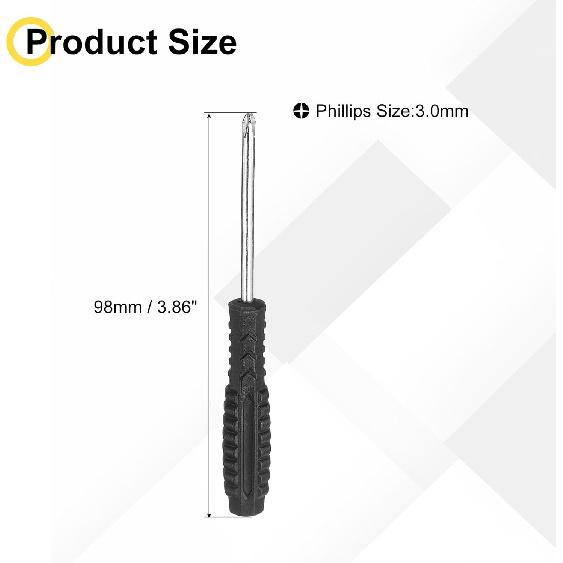 Size - 3.0mm cross head, 3.86" (98mm) total length. This screwdriver is a small screwdriver, suitable for handling some small screws, such as those used in electronic products, glasses, watches, etc.