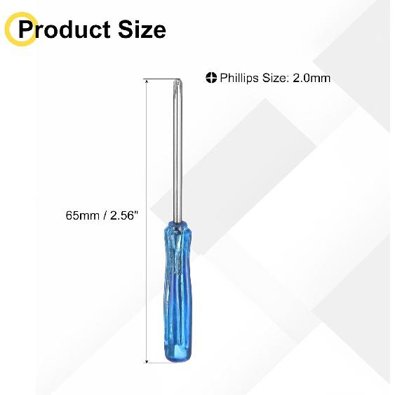Size - 2.0mm cross head, 2.56" (65mm) total length. This screwdriver is a small screwdriver, suitable for handling some small screws, such as those used in electronic products, glasses, watches, etc.