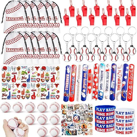 Value Baseball Party Favor Set: There are 134 baseball party supplies, including 12 drawstring baseball bags, 12 baseball temporary tattoos, 12 mini baseballs, 12 baseball silicone bracelets, 12 whistles, 12 baseball keychains, 12 snap bracelets, 50 baseball stickers.