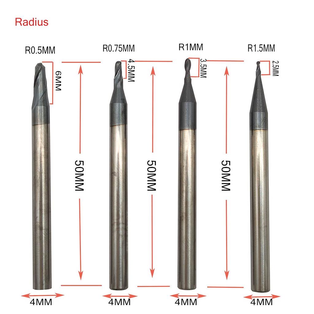 4pcs 0.5mm,0.75mm,1mm,1.5mm Ball Nose Carbide End Mill Set CNC Cutter Router Bits 2 Flute Spiral Milling Tool (4, 2F)