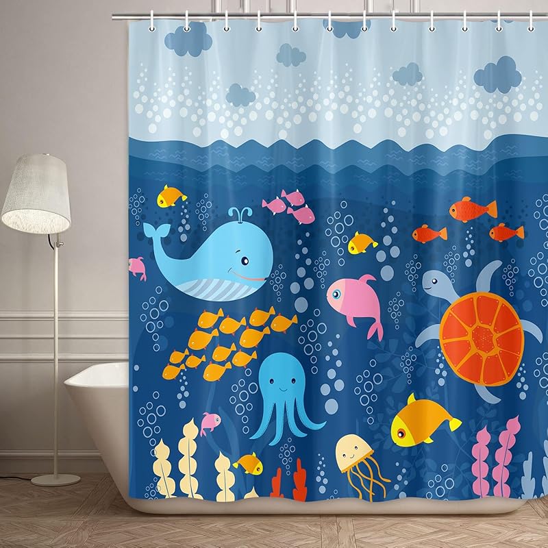 JAWO Cartoon Sea Creatures Fabric Shower Curtain for Kids, Under The Sea Bluey Whale Turtle Fish Kids Toddler Bathroom Decor Ocean Curtain for Girls