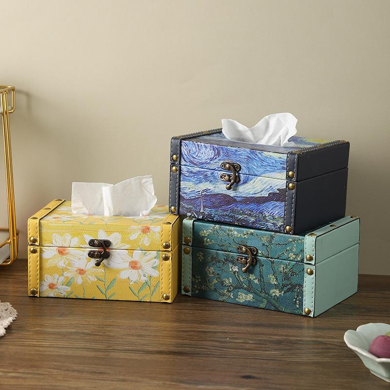 Originalität Ölgemälde von Blumen quadratisch Taschentuchbox Leder Aufbewahrungsbox Wohnzimmer Schreibtisch abgedeckte Papierbox