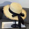 Korean version of bow straw hat women's 2025 big eaves travel versatile straw woven sunscreen visor flat top top hat