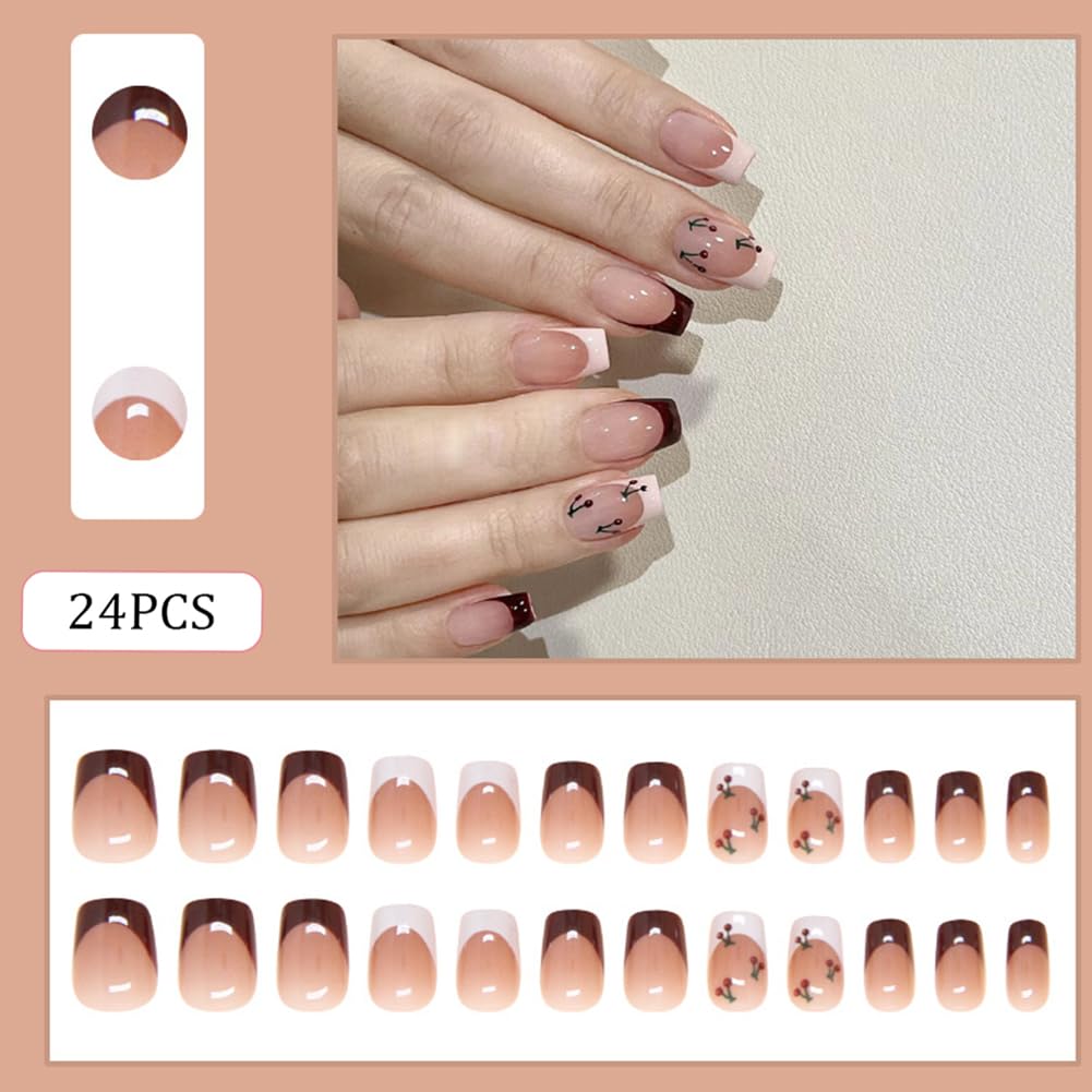 French Tip Press on Nails Medium Length Nails Press Ons 24Pcs Fake Nails Glue on Nails With Cute Little Flowers Stick on Nails Artificial Acrylic