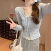 Spitzenbesatz Strickjacke mit Bindeband vorne Slim Fit Knopfleiste Pullover