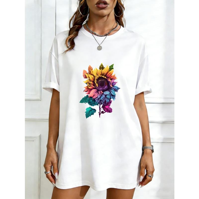 Übergroßes T-Shirt-Kleid Schwarz Regenbogen Sonnenblumen-Print Lässiger Streetwear-Stil
