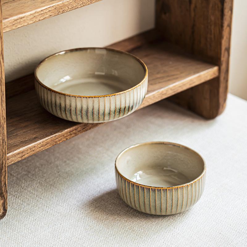Embossed Vertical Rice Bowl Kiln-Changed Ceramic Bowl Household Salad Bowl Noodle Bowl Round Small Bowl Minimalist Tableware