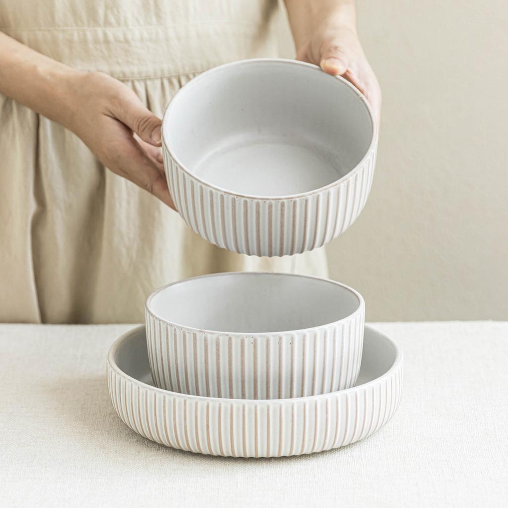 Embossed Vertical Bowl Set Ceramic Bowl Large Plate Household Dish Bowl Vegetable Plate Tableware Round Salad Bowl