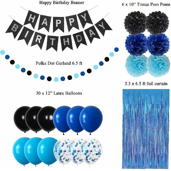 ANSOMO Blue and Black Happy Birthday Party Decorations for Boys Men Banner Balloons Navy Royal Light Blue Pom Poms Foil Curtain Décor Supplies 13th