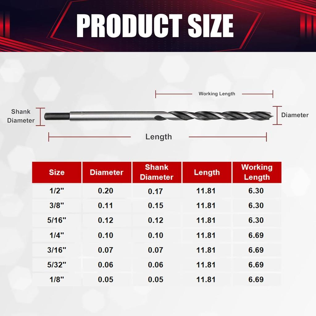 7 Pcs Extra Long Brad Point Drill Bit Set,12" 300mm Carbon Steel Wood Drill Bits Set,Fit for Bench Hand and Conventional Electric Drill