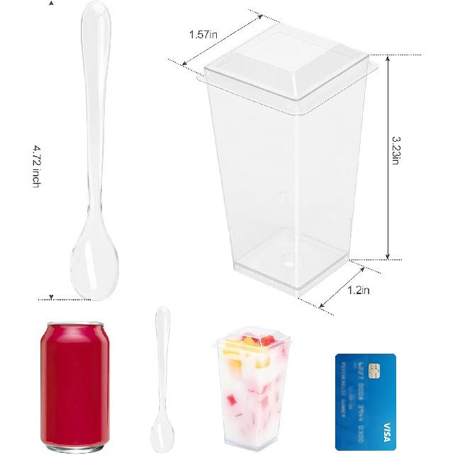 Package of mini dessert cups includes 50 plastic cups, 50 plastic lids and 50 plastic spoons, 50 ample cups support you handle any entertainment easily, meet most of your daily needs, please confirm the size before purchasing, capacity: 3 oz, cup height: 3.2in, cup top length: 1.57in, cup bottom length: 1.2in
