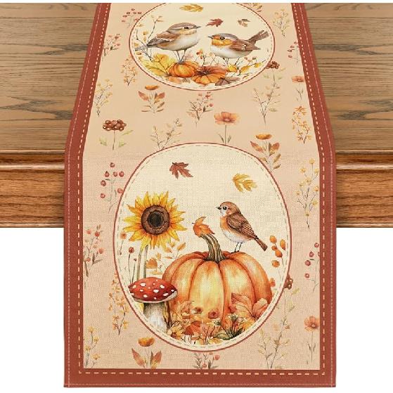 Artoid Mode Chinese Rural Style Pumpkin Bird Floral 210 GSM Fall Table Runner, Seasonal Autumn Kitchen Dining Table Decoration for Home Party Decor