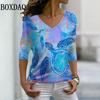 New Spring Women V-Neck Top Fashion Design Painting Printed Oversized T Shirt Daily Street Long-Sleeve Casual Tee Clothes
