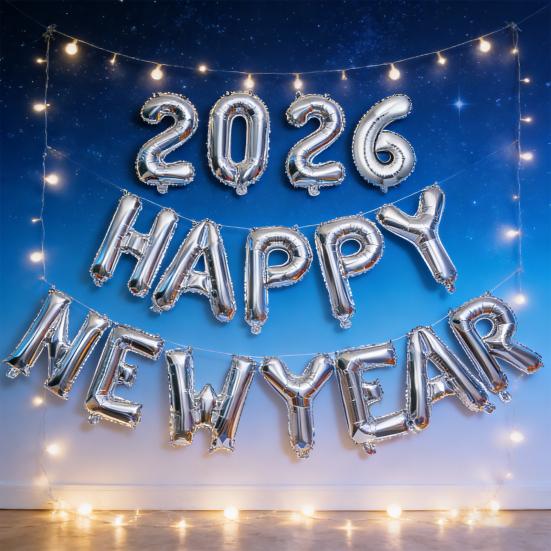Feiern Sie den Beginn des Jahres 2026 mit diesem Premium Happy New Year Ballon-Set, gefertigt aus hochwertiger Aluminiumfolie für ein glänzendes, langlebiges Finish.. Diese wiederverwendbaren Ballons verfügen über selbstschließende Technologie und behalten während Ihrer Feierlichkeiten ihre Form.. Das Set enthält Folienbuchstabenballons, die "Happy New Year" buchstabieren, einen aufblasbaren Strohhalm und ein Aufhängeband, und bietet alles, was für eine auffällige Partyhintergrund benötigt wird..