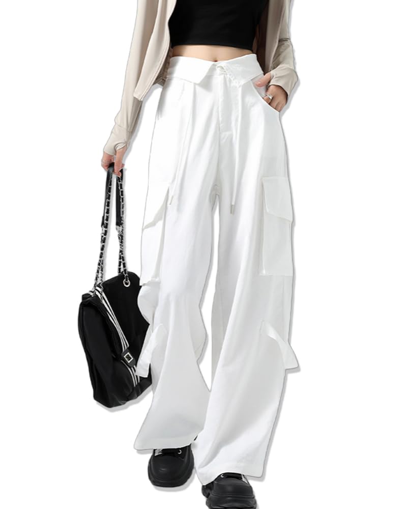 LUJPOIR Cargo Long Pants with Elastic Waist and Relaxed Loose Solid Color White Size M Women's Pants, Drawstring, Fit, Sweatpants, Fit, Casual,