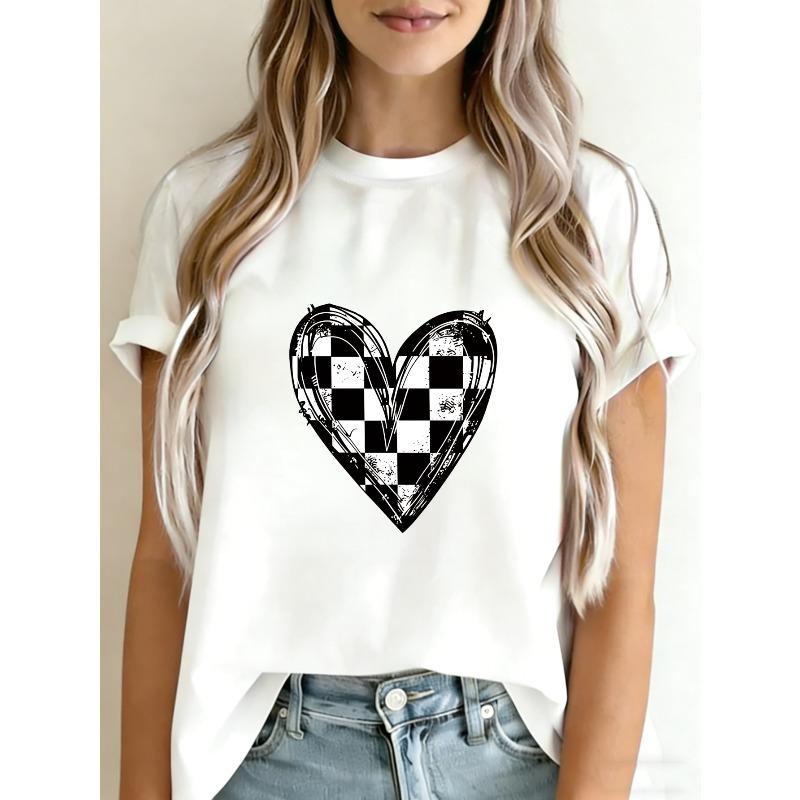 Weißes T-Shirt Mit Schachbrett-Herz-Print Für Freizeitkleidung
