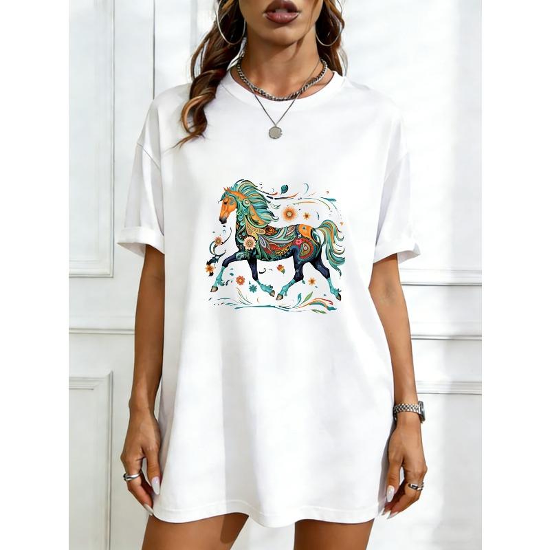 Übergroßes T-Shirt Kleid Schwarz Buntes Pferd Blumenmuster Freizeitkleidung für Damen Sommer-Outfit Streetstyle Mode Top