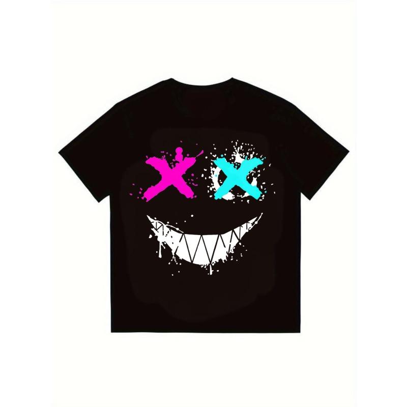 Schwarzes Herren-T-Shirt mit pink-blauem X-Augen- und weißem Grinse-Print, lässiges Streetwear-Oberteil für Alltag und Freizeit.