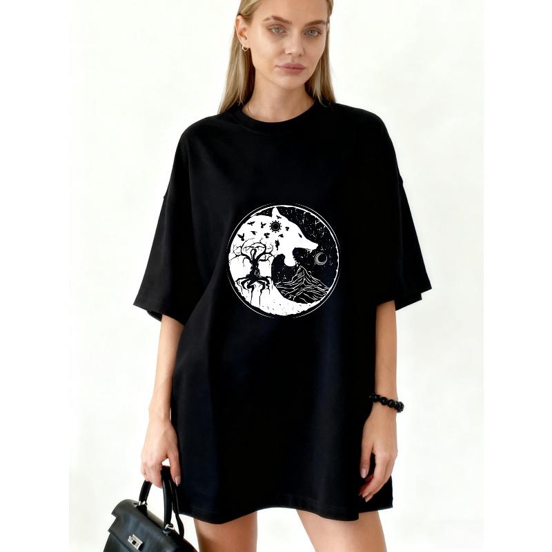 Übergroßes T-Shirt-Kleid Schwarzer Wolf und Mond Yin Yang Druck für Freizeitkleidung