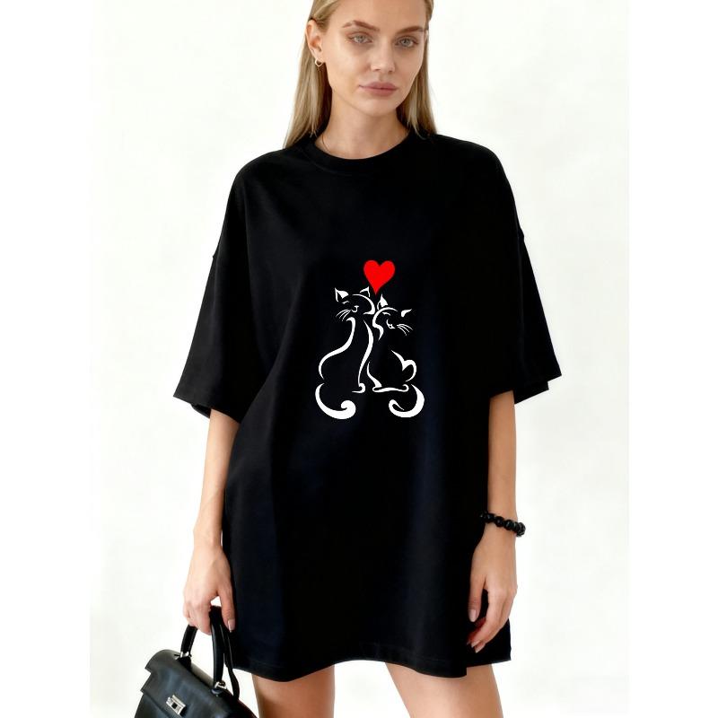 Übergroßes T-Shirt-Kleid Schwarze Katze und Herz-Print Freizeitkleidung für Damen