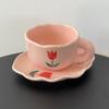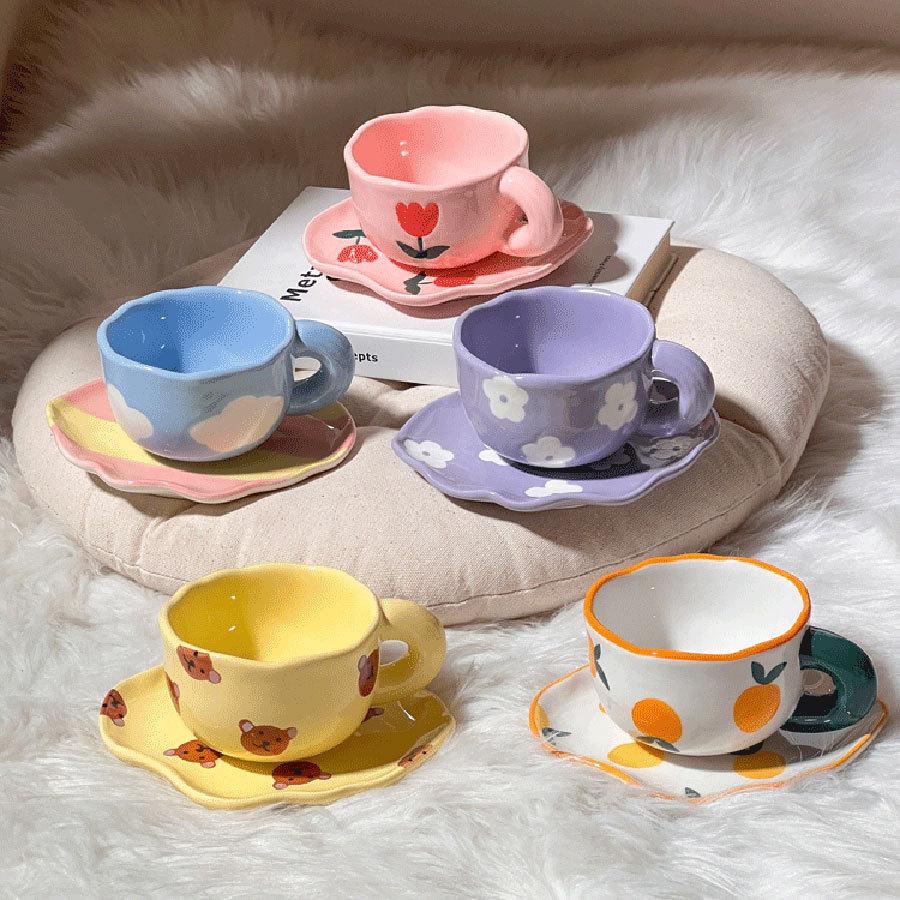 Girl'S Heart Hand-Painted Tulip Orange Bear Flower White Cloud Coffee Cup And Saucer Underglaze Irregular Ceramic Cup And Saucer