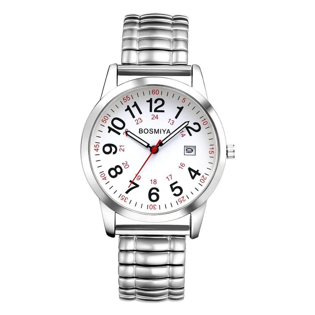 Herren 24-Stunden Wasserdichte Quarz-Armbanduhr mit Elastischem Armband, Edelstahl Analoganzeige, Kalender, Leicht Ablesbares Großes Display, Einheitsgröße Passt für die Meisten -