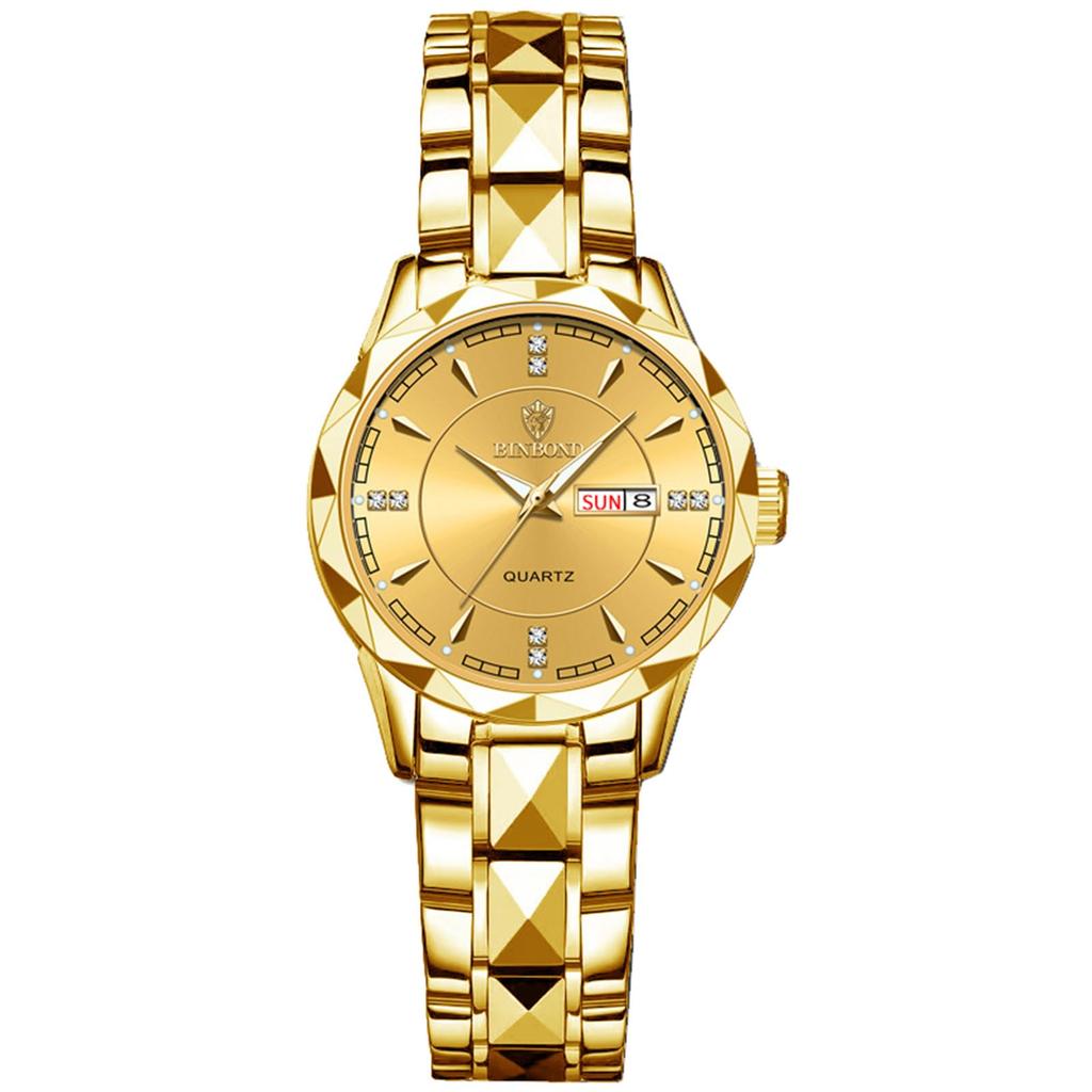 Damen Goldene Analoguhr mit Schlichtem Design, Tagesanzeige, Kalender, 3ATM Wasserdichtigkeit, Edelstahlarmband, Lässiger und Business-Stil -