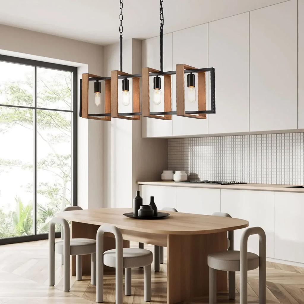 Rustic 4-Light Wood Pendant Chandelier – Farmhouse Ceiling Lamp for Dining, Island, & Living Room