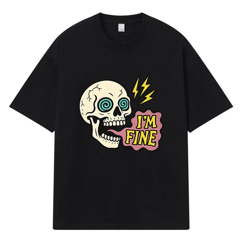 2026 Skull I'm Fine Printed Graphic Y2k Harajuku Streetwear 100% Cotton T Shirt Casual Oversized Summer Men T-shirt