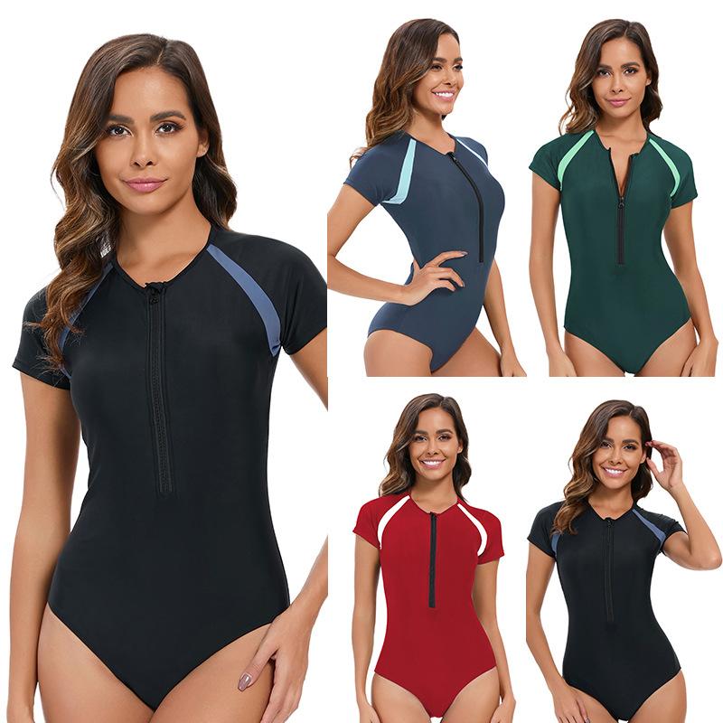 Color-Block Slim-Fit Kurzarm-Badeanzug Damen Surfer-Mode Konservativer Badeanzug