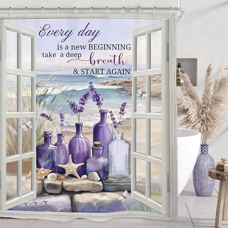 Miyotaa Beach Coastal Shower Curtain Set 60Wx71H Inches Sea Ocean Sunrise Sunset Scene Wave Seagull Hawaiian Seaside Waterproof Bathroom Curtain with