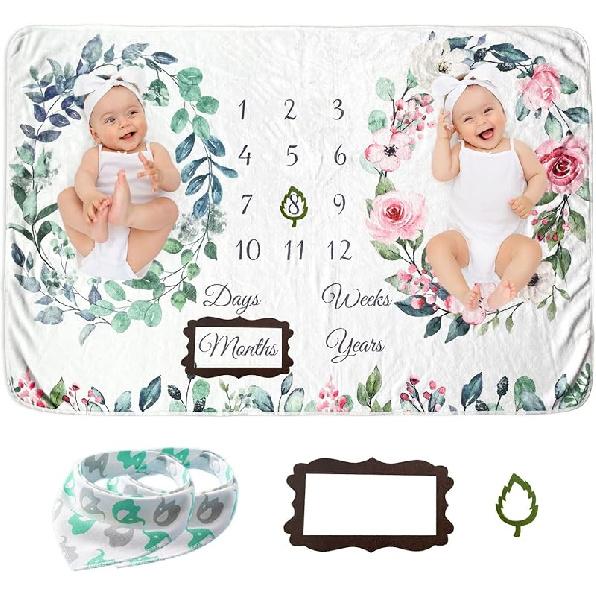 Twins Baby Milestone Blanket for Boys & Girls, Premium Flannel Photography Background Prop Blankets, Neutral Boho Floral…