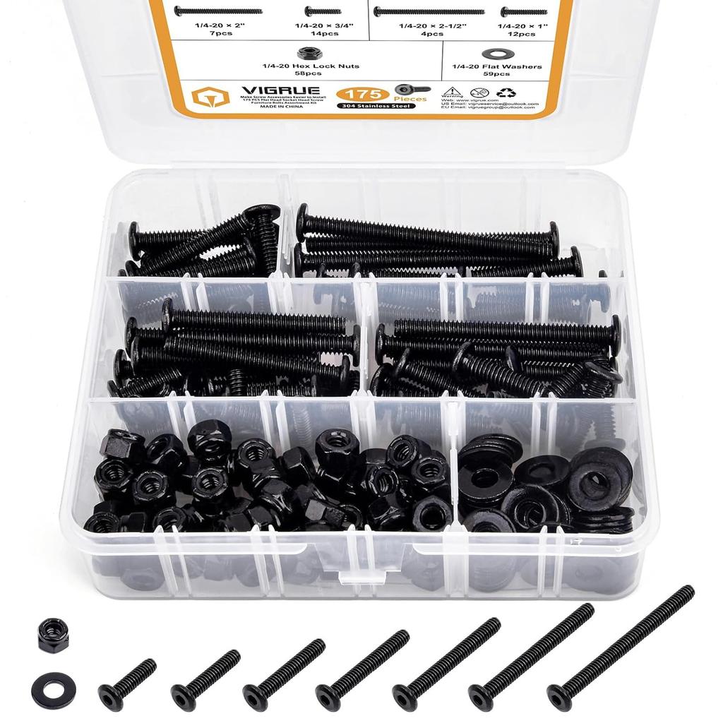 VIGRUE 1/4-20 Flat Socket Head Screw Assortment Furniture Bolts Countersunk Screws Lock Nuts Kit, Stainless Steel 18-8 (304), Black Oxide, Length