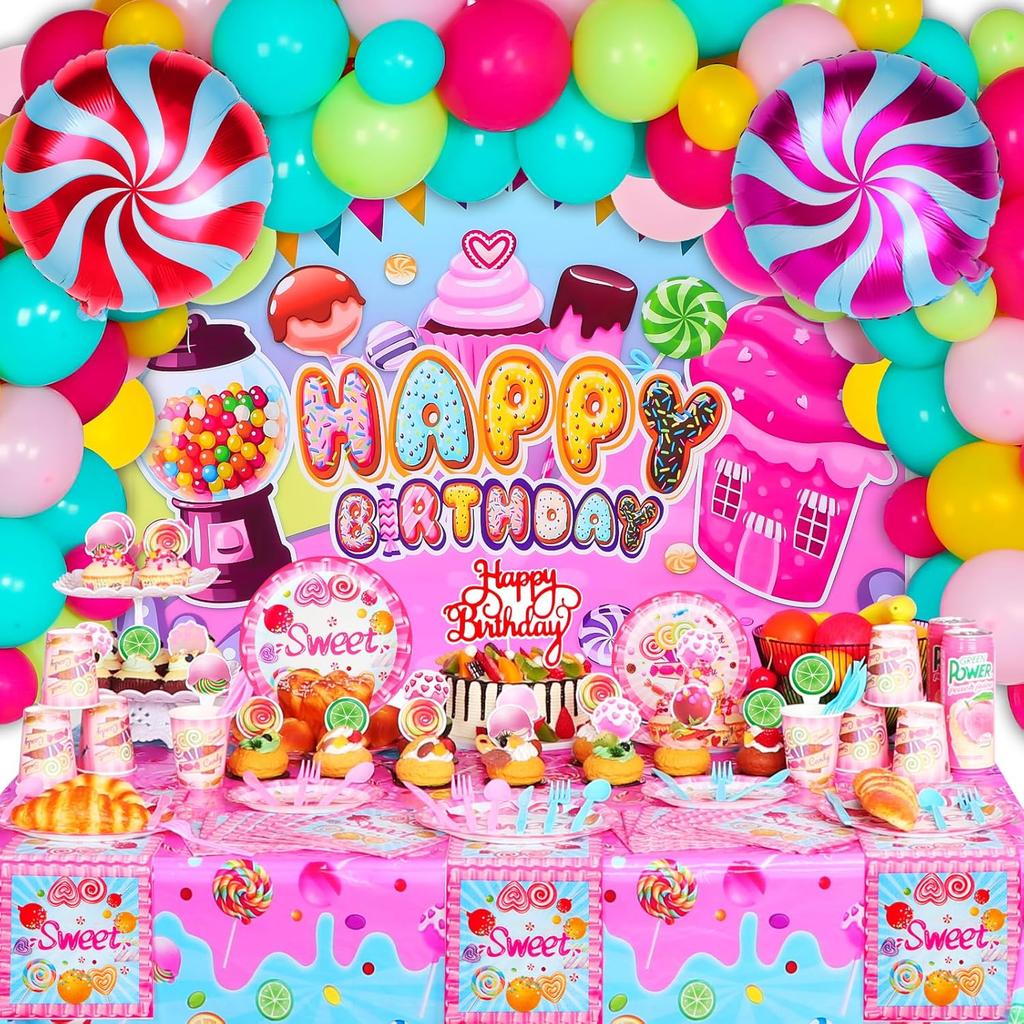 【High Quality Material】The Candyland backdrop is made of quality polyester, very smooth and flat, waterproof and colorfast, and easy to clean, all paper products are made of heavy-duty paper, and are all printed with food-grade water-based ink which is suitable for food contact. Lollipop-themed table cover is spill-proofed and stain-resistant, making it easy to clean up after the party. Balloons are made of natural latex, harmless and non-toxic, and safe to play around children