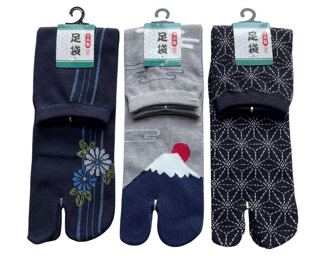 Tabi Socken aus japanischem Hanf und Set mit Berg Fuji Motiv für Herren, Japan, Stil, Chrysantheme, Blatt, Muster, 3 Paar (Verfügbare Farben)