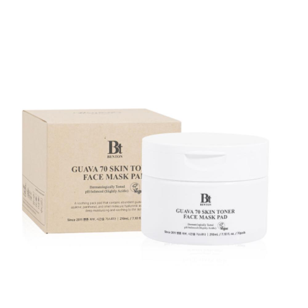 Soothe and hydrate sensitive skin with Benton Guava 70 Skin Toner Calming Pads. Includes one full pad pack and one refill for convenient daily wipe-off and mask-pack care.
