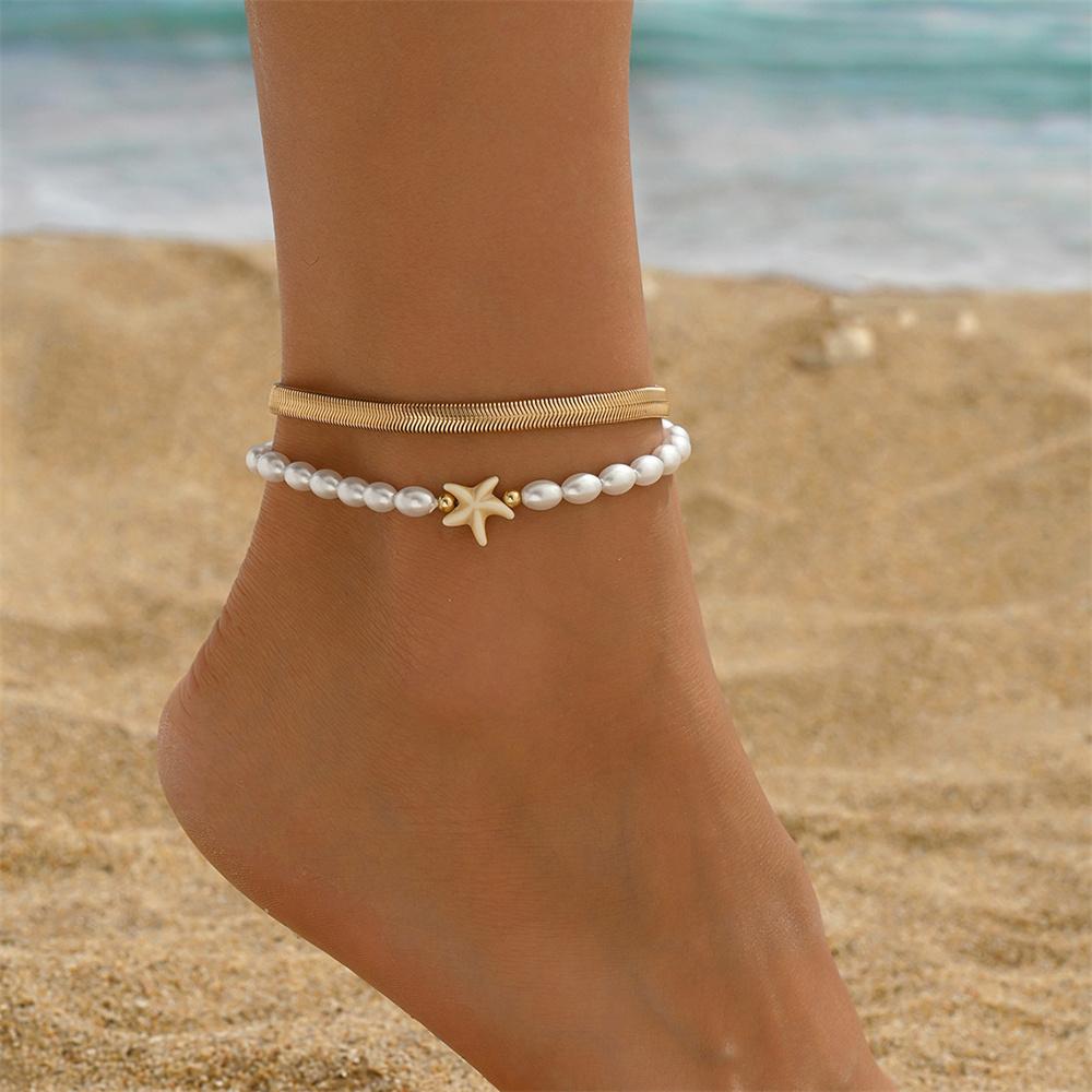 Snake Bone Foot Chain Simulated Pearl Starfish Anklets For Women Trendy Gold Color Ankle Bracelet Beach Jewelry Summer Accessory