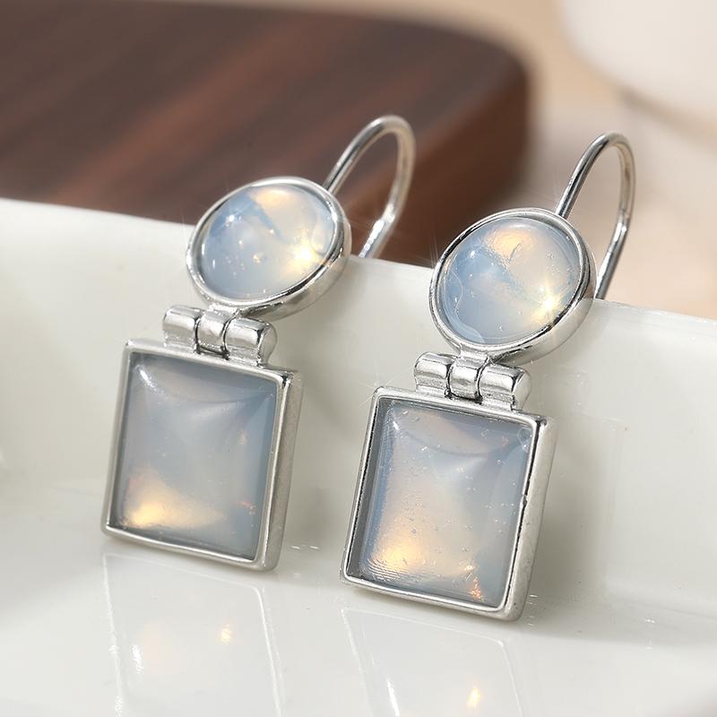 Silvery Geometry Inlaid Imitation Moonstone Dangle Earrings for Women Classic Elegant Pendant Jewelry Accessories Crafts