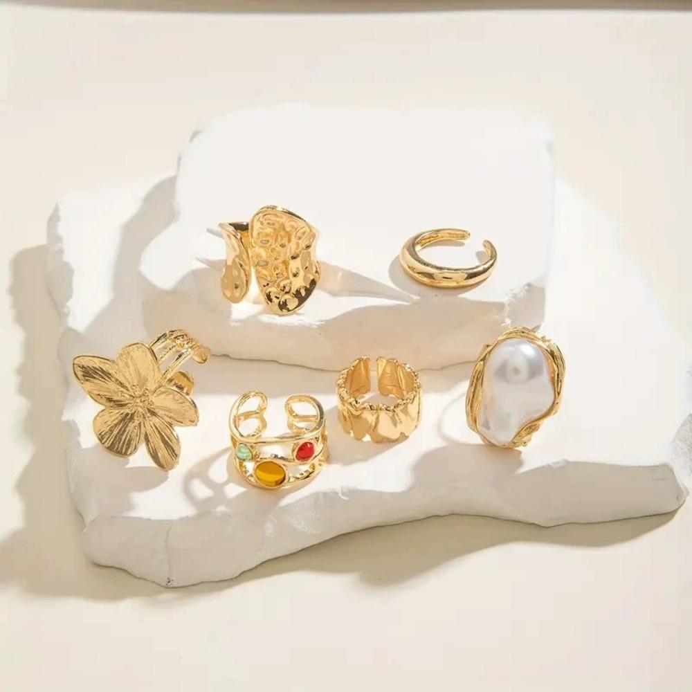 6 STK Unregelmäßige Übertriebene Metallblume Offene Ringe Damen Elegant Barock Imitationsperlenring Schmuckzubehör