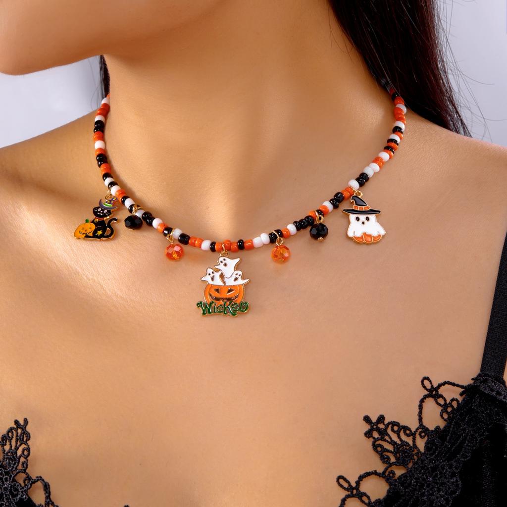Halloween Halskette Spinnennetz Fledermaus Herz Geist Schwarze Katze Kürbis Anhänger Perle Gotischer Schmuck Für Frauen Männer Party Zubehör Geschenk